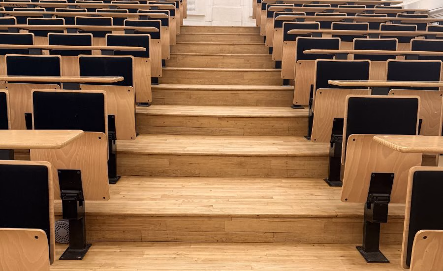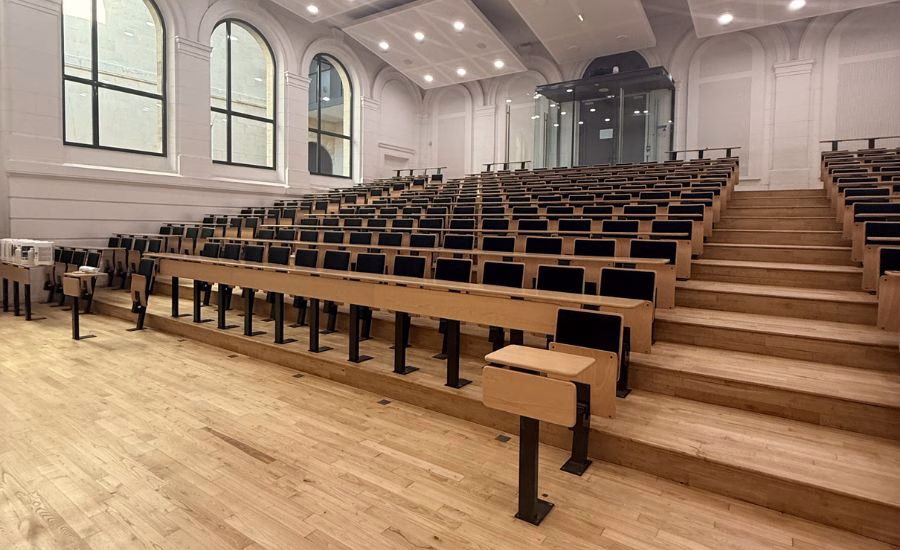 Le parquet de l’amphithéâtre a retrouvé tout son éclat. La lumière joue à nouveau sur les lames, révélant la noblesse du bois, pendant que la finition BONA Traffic HD garantit une protection durable, prête à accueillir les générations d’étudiants à venir.